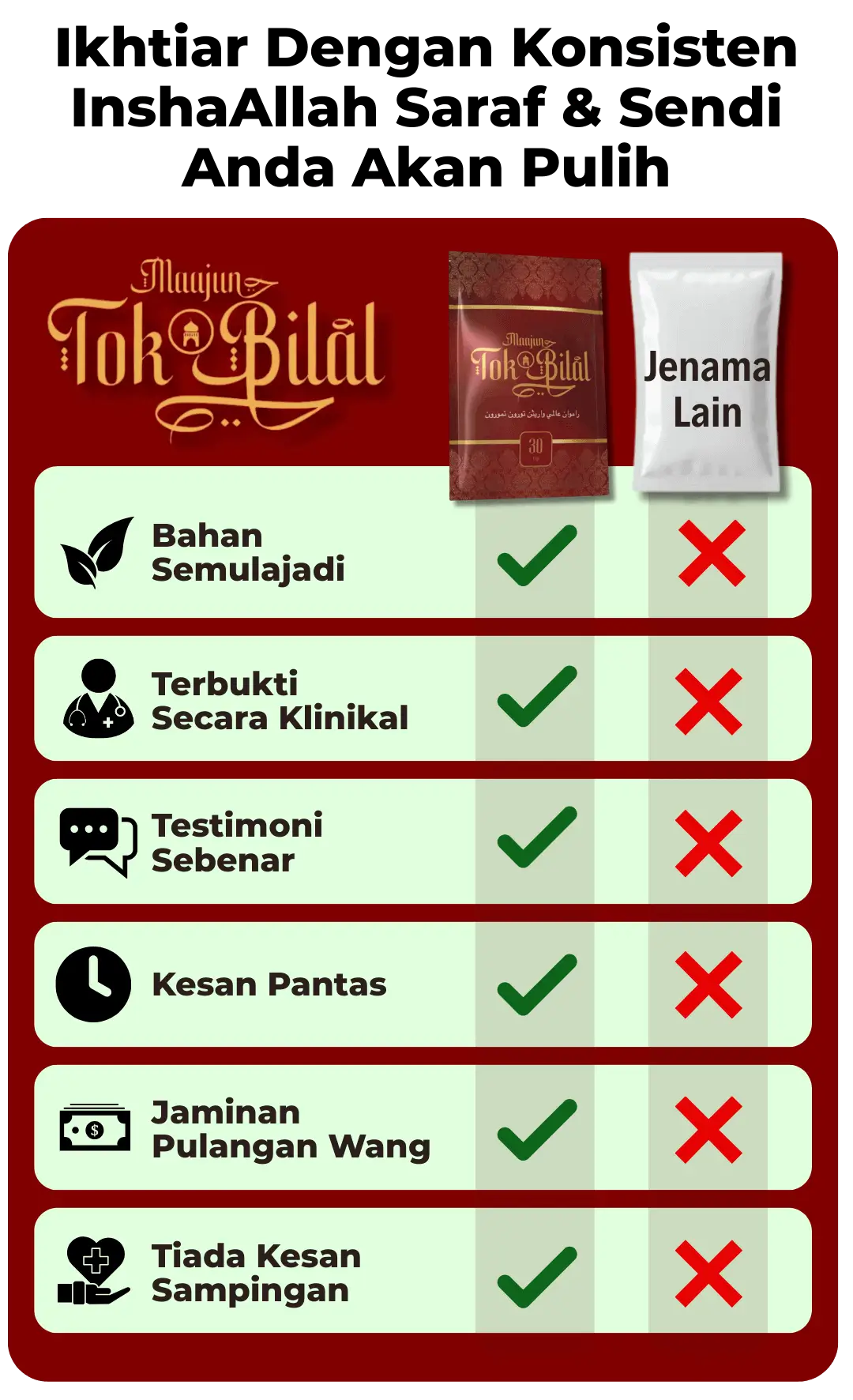Anda tak perlu risau. ianya berbeza dari jamu/majun/ubatan kimia yang lain. Maajun Tok Bilal 100% diperbuat dari 100% herba. Tiada sebarang kesan sampingan.
